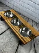 Diese handgefertigte Futterstation für Katzen bringt Wärme in Ihr Heim. Die Kombination aus minimalistisch gehaltenen Füßen, hochwertigen Näpfen und der einzigartigen Holzbohle mit Epoxidharz vereint alles, was das Herz des Individualisten höher schlagen lässt.